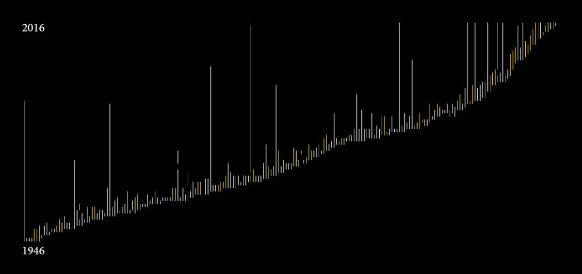 Vorderseite: 214 angestellte Mitarbeiter als Linien auf der Zeitachse von 1946 bis 2016, davon 38 Lehrlinge als Goldlinien.