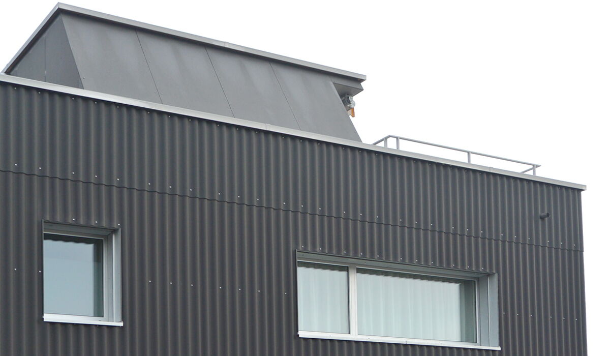 Zweigeschossiger Holzbau mit Dachterrasse.