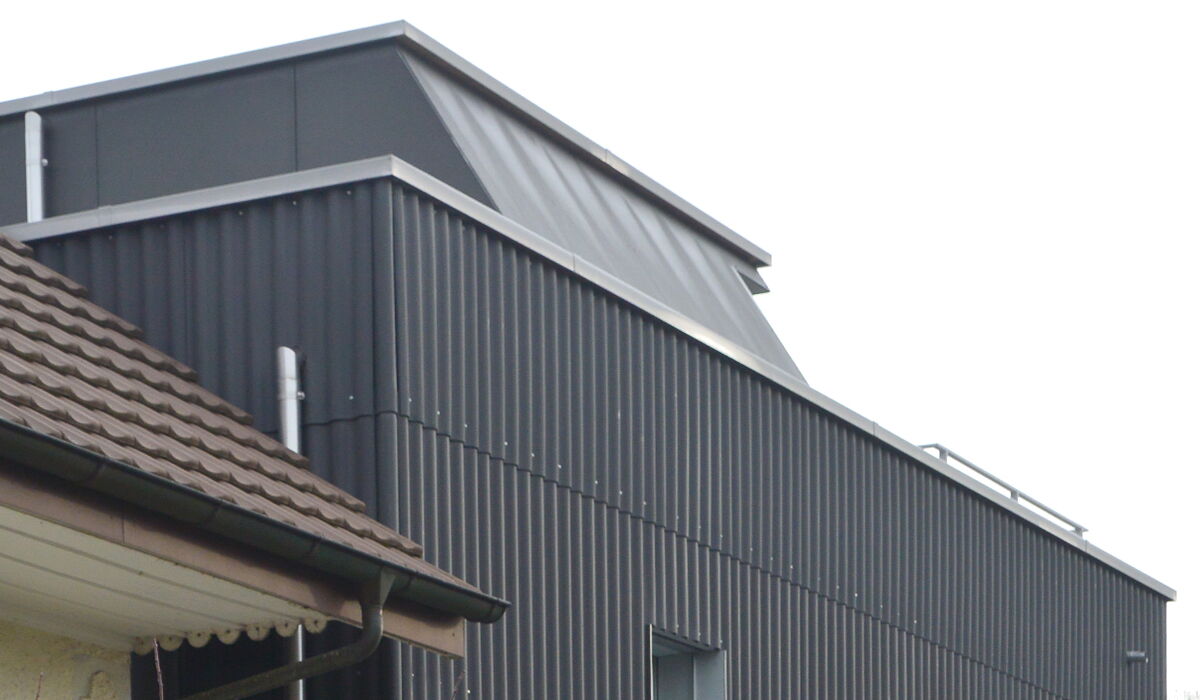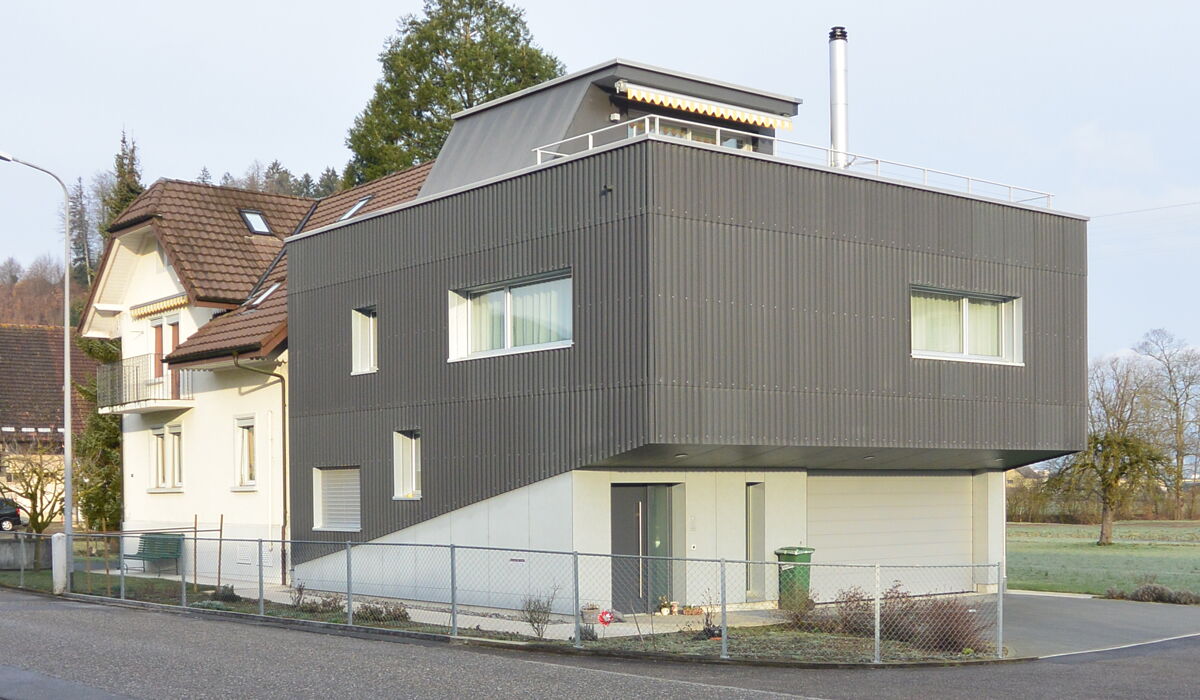Das bestehende Einfamilienhaus steht im Weiler Refental südlich von Gränichen. Die Wohnlage direkt unter dem Schloss Liebegg zeichnet sich unter anderem aus, durch seine Weitsicht auf die Jura-Bergkette. Der neu erstellte Erweiterungsbau des Zweigenerationen-Hauses ist einerseits räumlich verbunden mit dem Altbau setzt sich aber in Form und Material bewusst davon ab. Der zweite Hauszugang und eine Doppelgarage bilden das Sockelgeschoss des Anbaus. Darüber auskragend liegt das mit dem Altbau verbundene Wohngeschoss. Der optisch aufgesetzte Gebäudekörper ist verkleidet mit grossformatigen Zementkompositplatten (Swisspearl, Ondapress 57). Ein beheizter Treppenaufgang erschliesst die grosszügig gestaltete Dachterrasse.