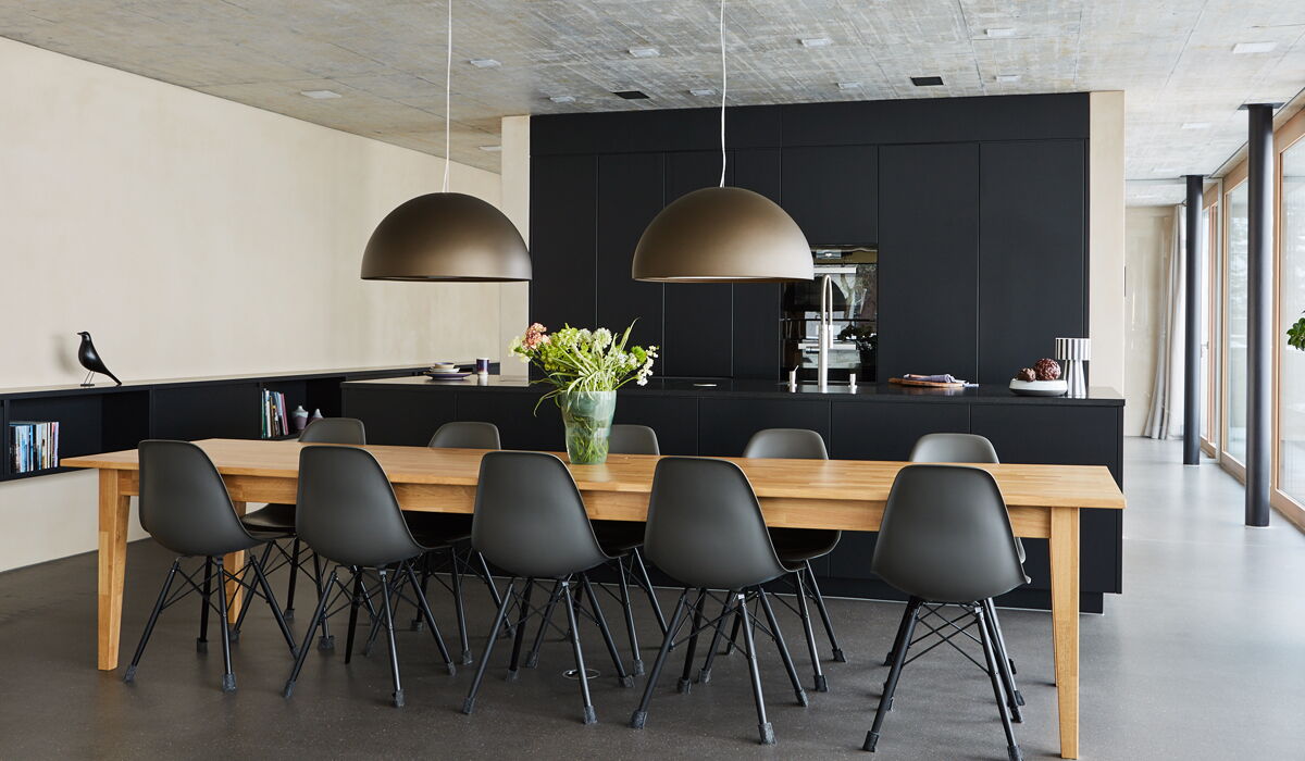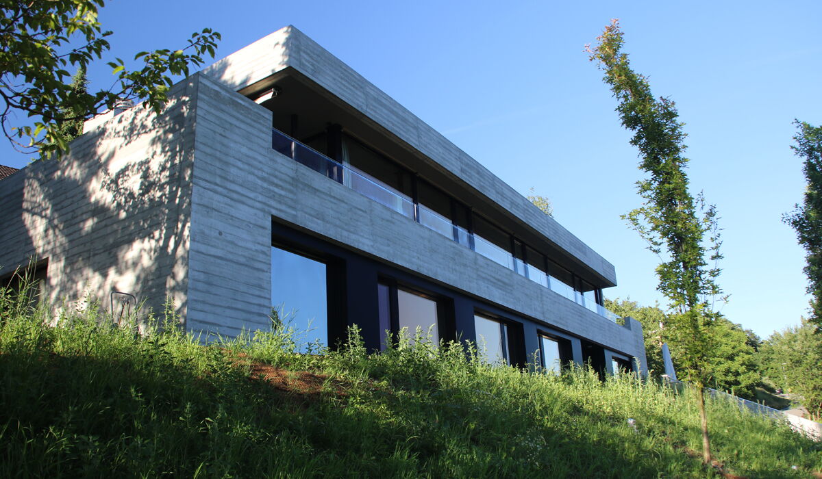 Das in Zusammenarbeit mit den Aarauer Architekten Alan Wakefield und Thilo Gruner entworfene dreigeschossige Gebäude zeigt eine klare Grundrissdisposition. Die grosszügig gestalteten Fensterflächen. die Sichtbetonfassade mit horizontaler Brettstruktur und die inneren Wandverkleidungen in Lehmputz und Holzwerkstoffen sind Zeugen einer modernen Wohnkultur der Bauherrschaft.