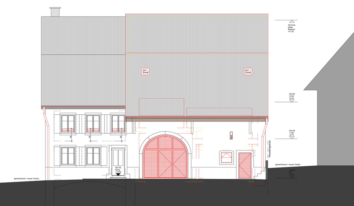 In enger Zusammenarbeit mit der kantonaler Denkmalpflege Baselland erfolgte der Umbau des Ökonomieteils: neue Fassaden- und Fenstergestaltung, neue Dacheindeckung, Restaurierung der Krüpfenwand und des alten Dachstuhls. Das Raumprogramm beinhaltete einen modernen, Wohnungsausbau im Ober- und Dachgeschoss, einen grosszügig gestalteten Eingang , mit Technik- und Nebenräume im Erdgeschoss.