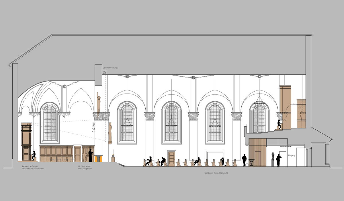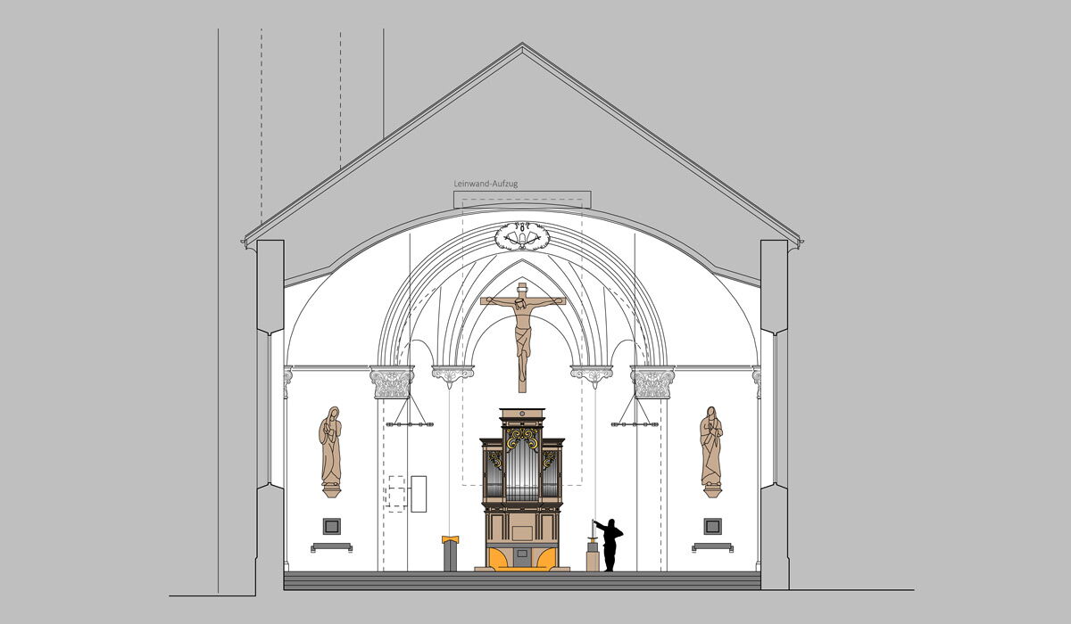 Unser Projektvorschlag knüpft am historisch gewachsenen Bestand an. Die Chororgel, welche am heutigen Standort die Raumabfolge Kirchenschiff - Chor verstellt und als fester Bestandteil der Innenausstattung betrachtet wird, soll um 180° gedreht in die Apsis verschoben werden.
