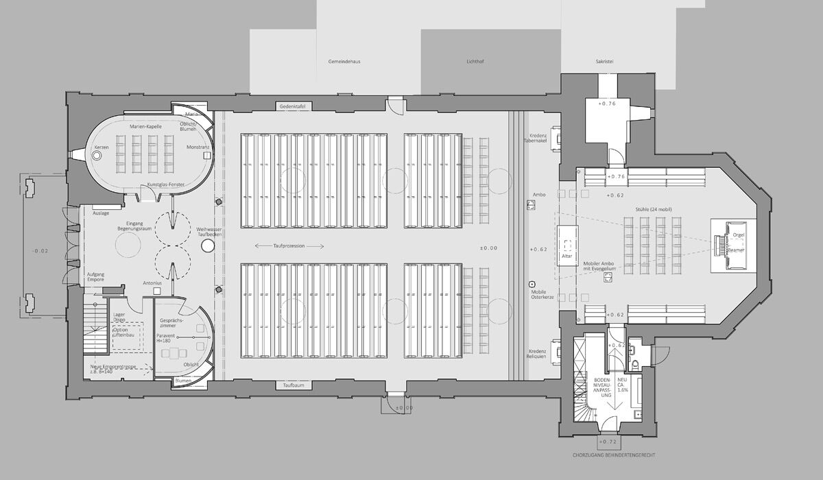 Neue Eingriffe erfolgen gezielt, auf grosse Gesten soll verzichtet werden. Mit unserem Projektvorschlag wird das historisch gewachsene Bild der einfachen Kirche, die entsprechend der finanziellen Möglichkeiten der Kirchgemeinde etappenweise ausgestattet wurde, weiter.